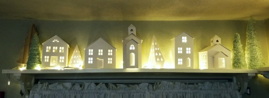 These houses are from Michael’s and I made the green trees with Styrofoam cones and green yarn. The white abstract trees were from Hobby Lobby.