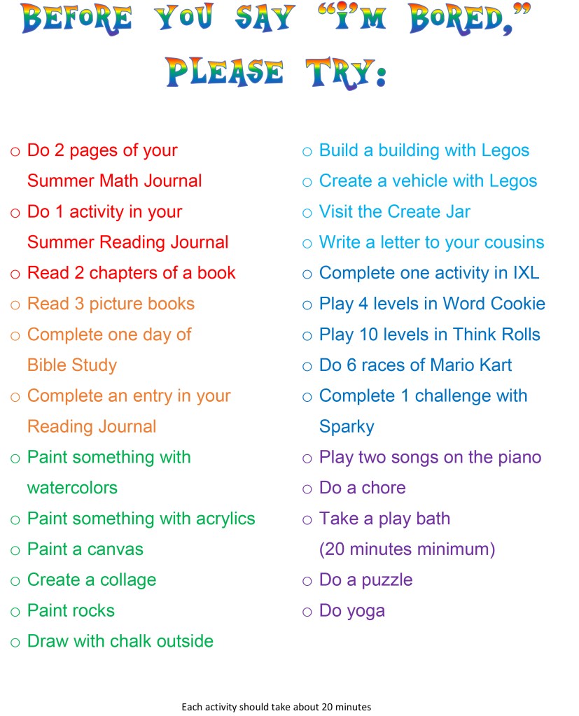 Do 2 pages of your Summer Math Journal – MyChild’s school sent home a workbook to help prevent the summer slide. In the past, I’ve purchased these.